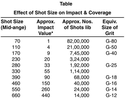 Wheel diameter and rotation RPM govern the velocity in centrifugal blast unit. Standard 19.5" diameter wheel at 2250 RPM develops abrasive velocity of approximately 245 ft/sec (or 167 miles per hour). Thus the impact force delivered to the work piece will change only if the mass factor (i.e. the abrasive size) is altered. The relationship of abrasive size to both impact power and coverage is shown in Figure 3 (i.e. a Table) here.
