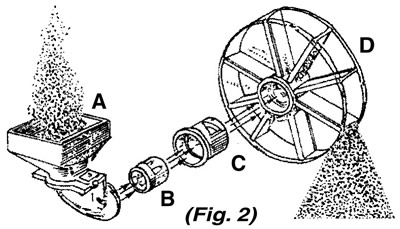 The Wheel (Abrasive Throwing Device) (Fig.2): Abrasives (A) fed through opening into Impeller (B), pass through Stationary Control Cage (C), and are immediately picked up by the Rotary Blade (D). Blade repeats these operations approximately 300 times in a second. The impact coverage of the steel abrasive is governed by its mass and velocity in accordance with the equation of kinetic energy