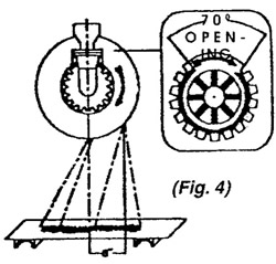Blast Pattern : Figure 4 shows Blast Pattern located at 8" to the right of the vertical centerline on a clockwise wheel. The pattern is called Hot Spot and will feel quite warm to the hand, if touched immediately after shot blasting. The 1/2" movement of control cage opening will shift the Blast Pattern by several inches.