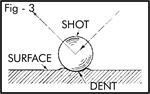 called steel shot. Each piece of shot striking the material acts as a tiny peening hammer, imparting to the surface a small indentation or dimple (Fig. 3). In order for the dimple to be created, the surface fibers of the material must be yielded in tension. Below the surface, the fibers try to restore the surface to its original shape, thereby producing below the dimple, a hemisphere of cold-worked material highly stressed in compression. Overlapping dimples develop a even layer of metal in residual compressive stress. It is well known that cracks will not initiate or propagate in compressively stressed zone. Since nearly all fatigue and stress corrosion failures originate at the surface of a part, compressive stresses induced by shot peening provide considerable increases in part life. |